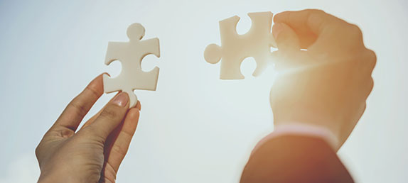 Two hands holding interlocking puzzle pieces. Corporate matching enhances donations to tax-deductible 501(c)3 organizations.